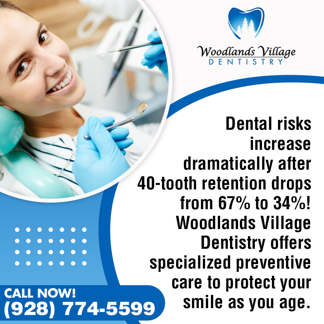 FLAGSTAFF, AZ – Woodlands Village Dentistry, one of the leading dentists in Flagstaff, AZ, is highlighting data showing that adults often experience noticeable changes in dental health beginning around age 40. Research from medical experts indicates that tooth retention decreases from 67% to 34% between early and mid-adulthood, while periodontal disease rates increase from 35% to 46%.