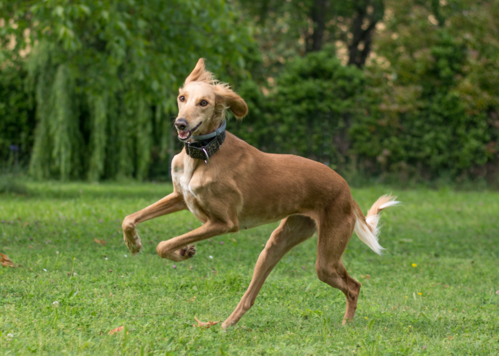 This tall, slim dog is also known as the Arabian greyhound because of its origins in the Arabian Peninsula, possibly in the ancient town Saluq, in Yemen. While greyhounds are considered the fastest dogs, the 1996 Guinness Book of World Records credited a Saluki as the world record-holder for the fastest dogâthat speedy pup reached a pace of 42.75 mph.